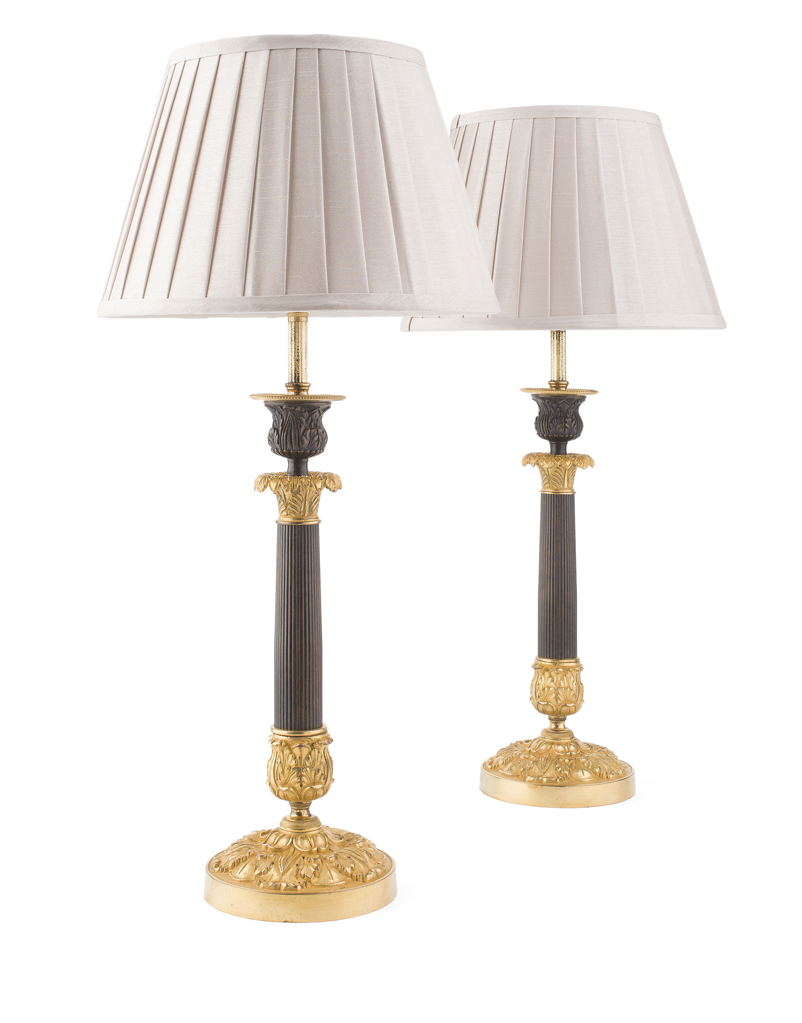 candlesticks, later converted to lamps with grey pleated silk shades, each with leaf cast nozzles and drip trays above reeded tapered columns and corresponding leafy bases (2)