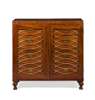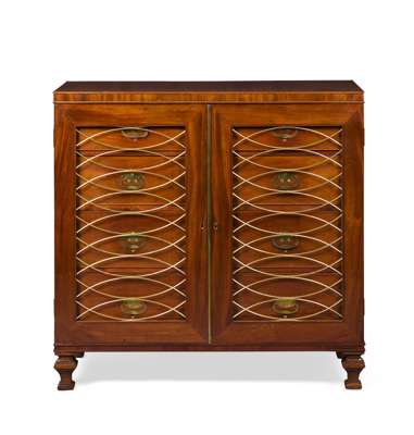 the rectangular top over a pair of brass grille insert doors opening to four long drawers with brass recessed handles, raised on square waisted feet