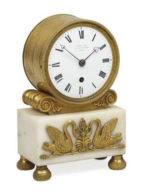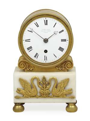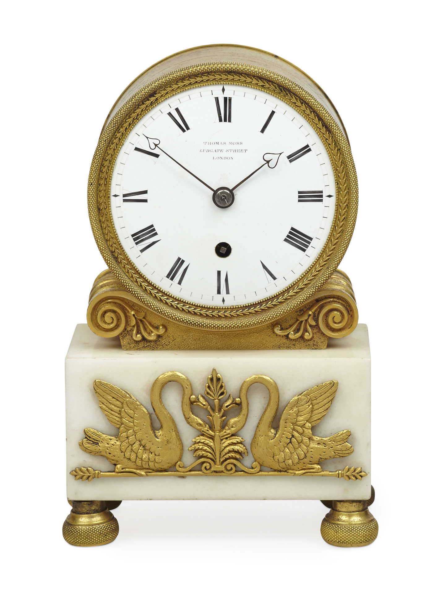 the circular white enamel dial with Roman numerals and a single winding hole, inscribed THOMAS MOSS / LUDGATE STREET / LONDON, in a cylinder case, the backplate engraved T. Moss/ Ludgate St./ London / 110, raised on a white marble plinth with gilt bronze mounts with a pair of swans, on bun feet; with an eight day chain fusee movement