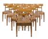 the curved panel back rails over horizontal splats with circular bosses, above stuffover seat raised on tapered and faceted legs headed by carved anthemion, on lobed lotus feet; comprising one armchair and nine side chairs (10)