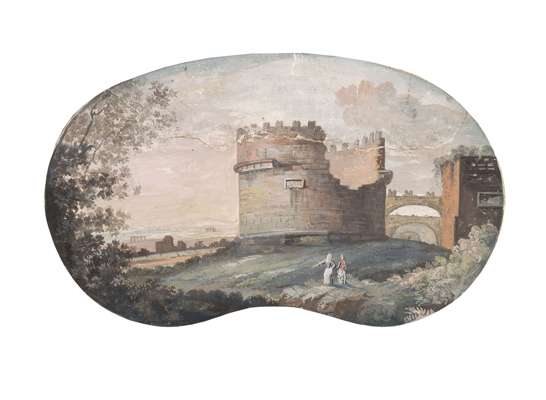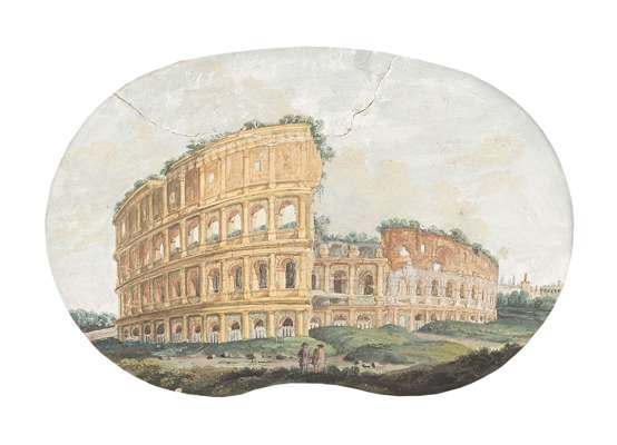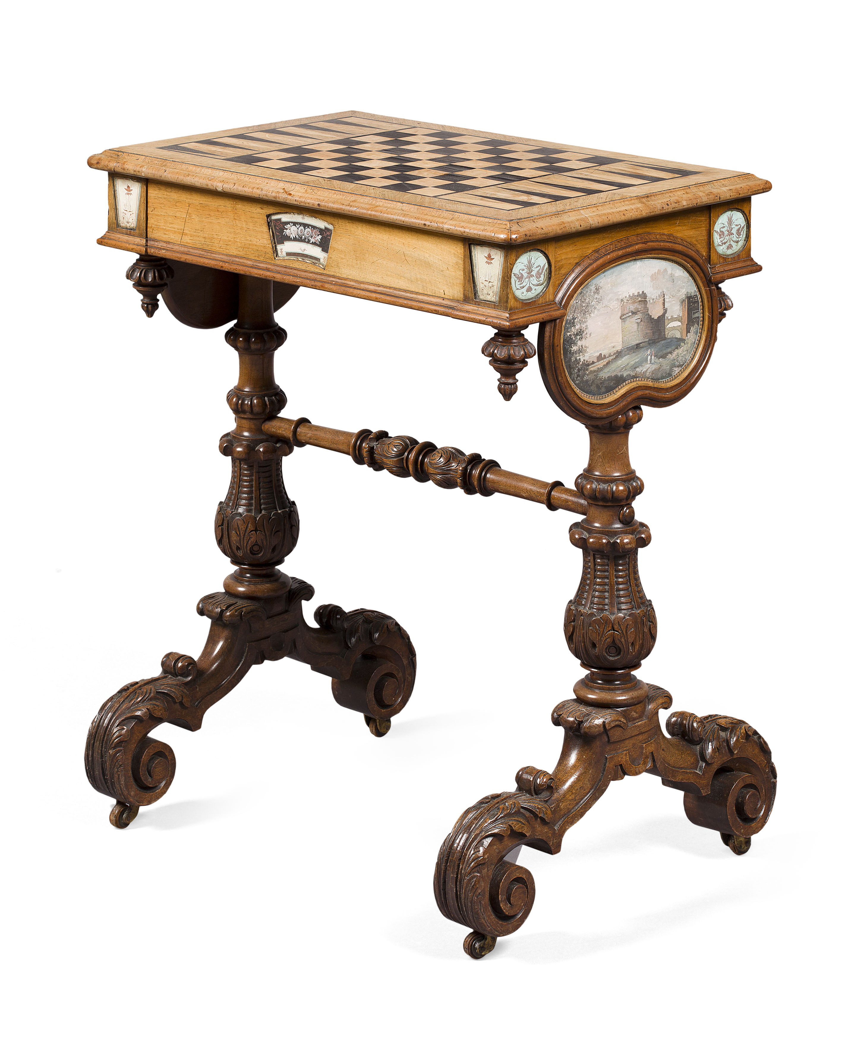 the moulded rectangular top with an inlaid games board over a single frieze drawer, the frieze mounted with painted watercolour panels of flowers, the sides with large reniform panels depicting the Coliseum and classical ruins, on foliate carved baluster end supports and acanthus carved scroll feet, on casters