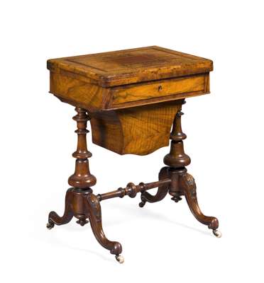the foldover top with Tunbridge Ware banding opening to a top fitted for games, above a single frieze drawer and sliding compartment, raised on turned and carved trestle supports, joined by a stretcher and raised on porcelain casters