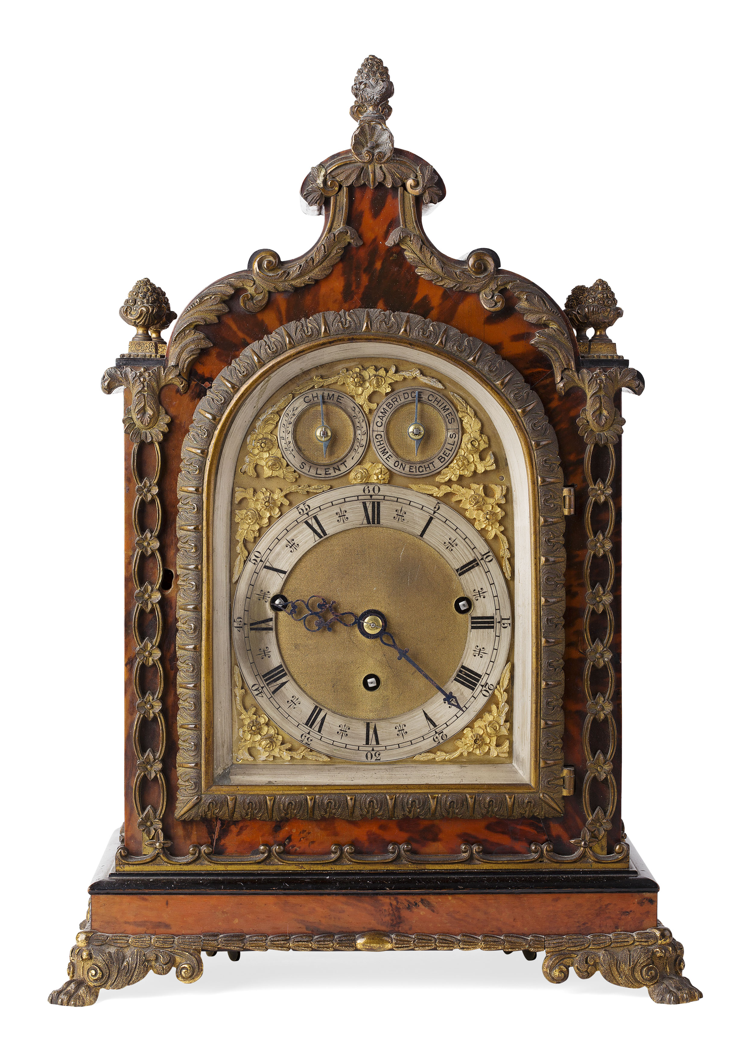the gilt face with silvered chapter ring and two subsidiary dials, the triple train movement striking on a gong and eight bells, the backplate with foliate engraved decoration, the tortoiseshell veneered arched case with applied ornament and six acorn finials, raised on cast lion's paw bracket feet