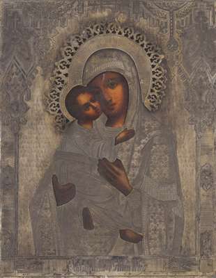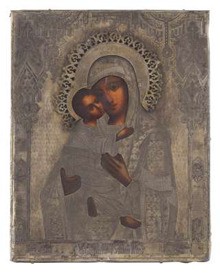 FRAMED RUSSIAN ICON OF THE MOTHER OF GOD FEODOROVSKAYA AND SILVER OKLAD