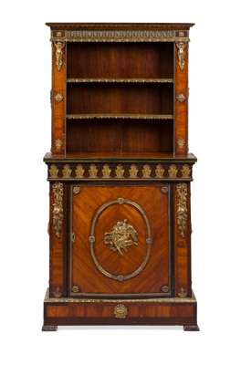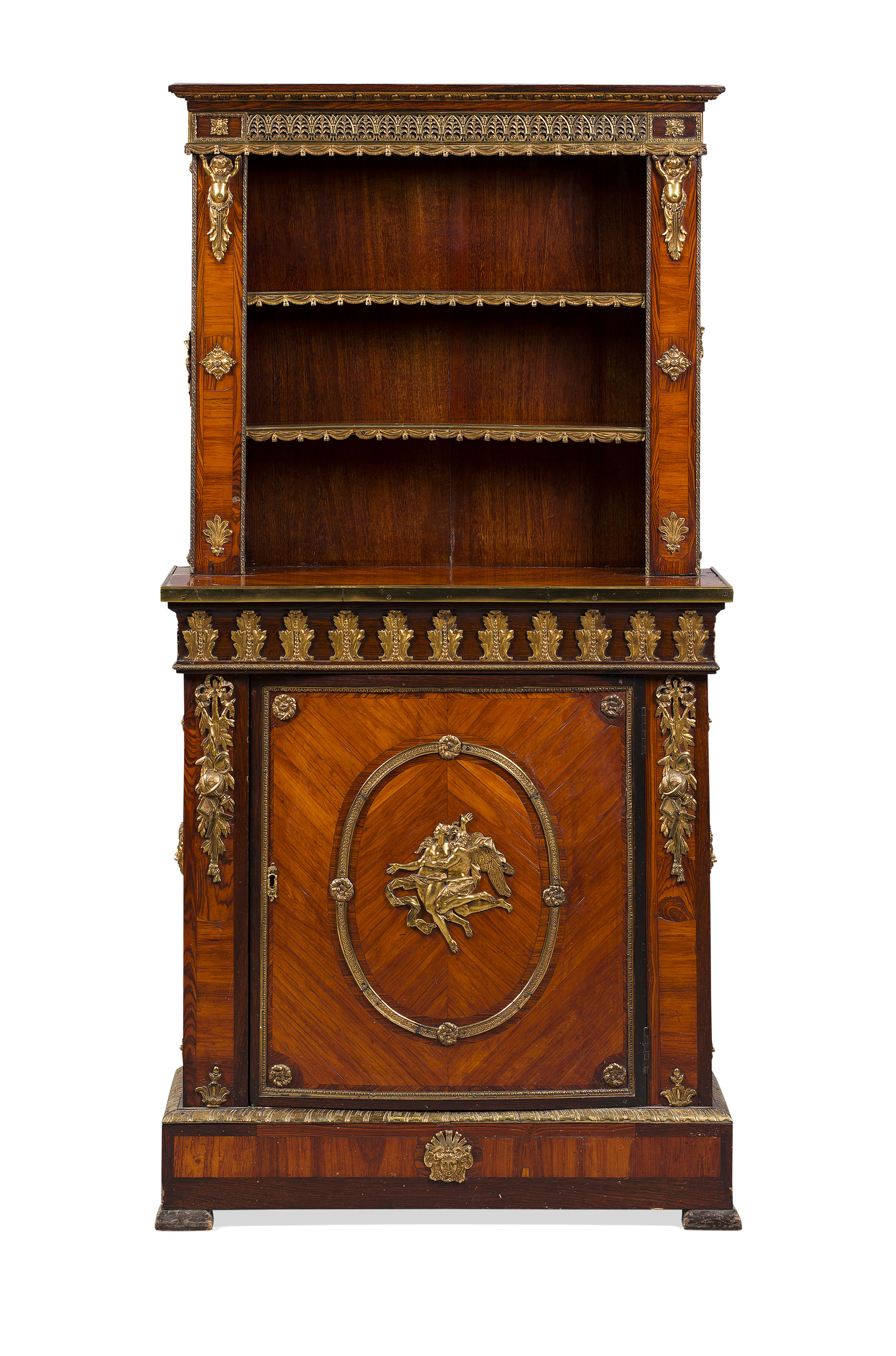 the upper part with two open shelves; the lower part with wide frieze with acanthus gilt metal mounts; the lower part with a single cupboard door centred by a gilt bronze mount depicting Kronos abducting Persephone, on a plinth base, with further gilt metal mounts throughout
