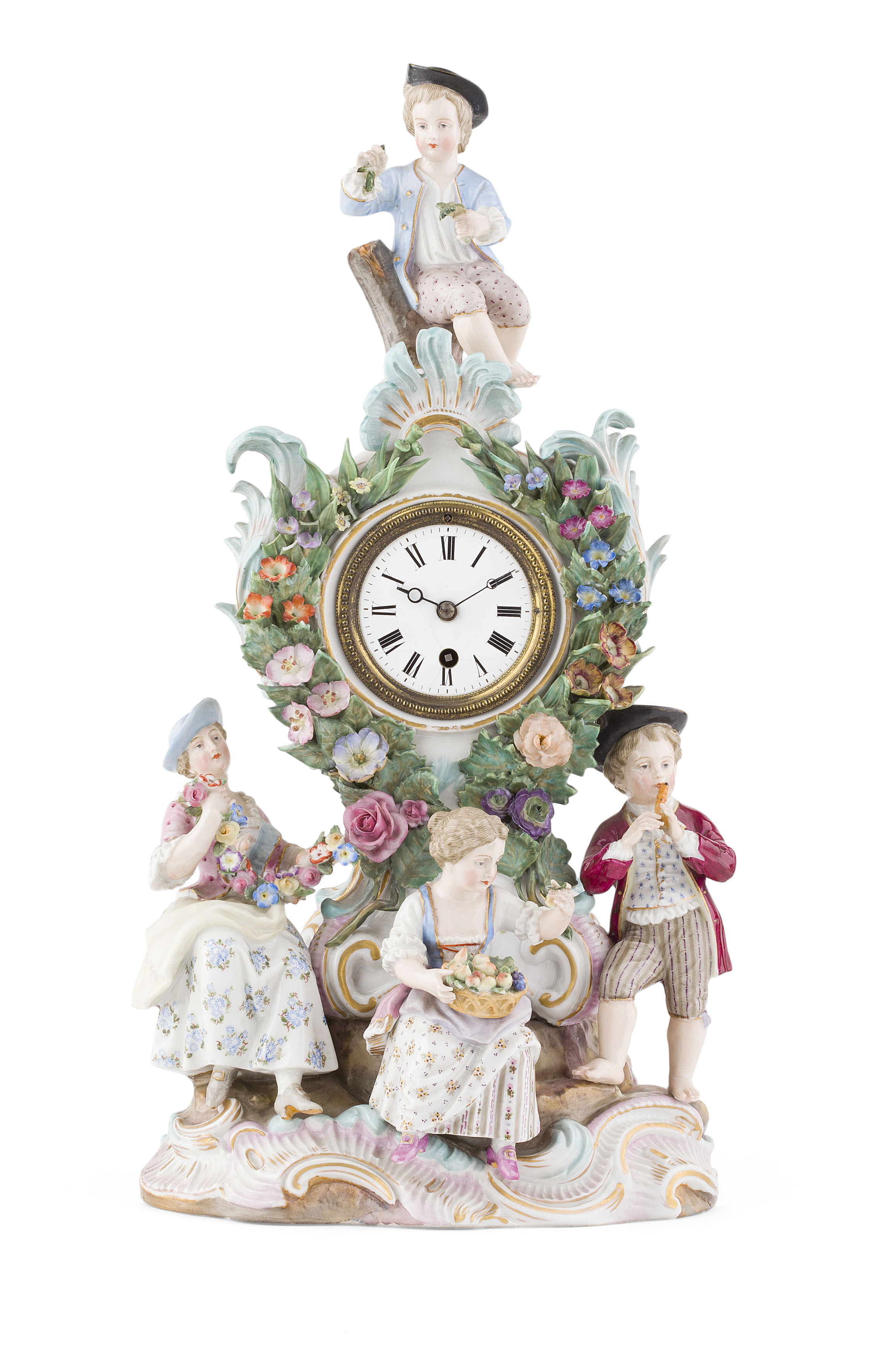 the single train movement with circular enamelled dial, within a waisted case decorated in gilt and coloured enamels with applied flowers and figures on a rococo scrolling base, painted mark to base