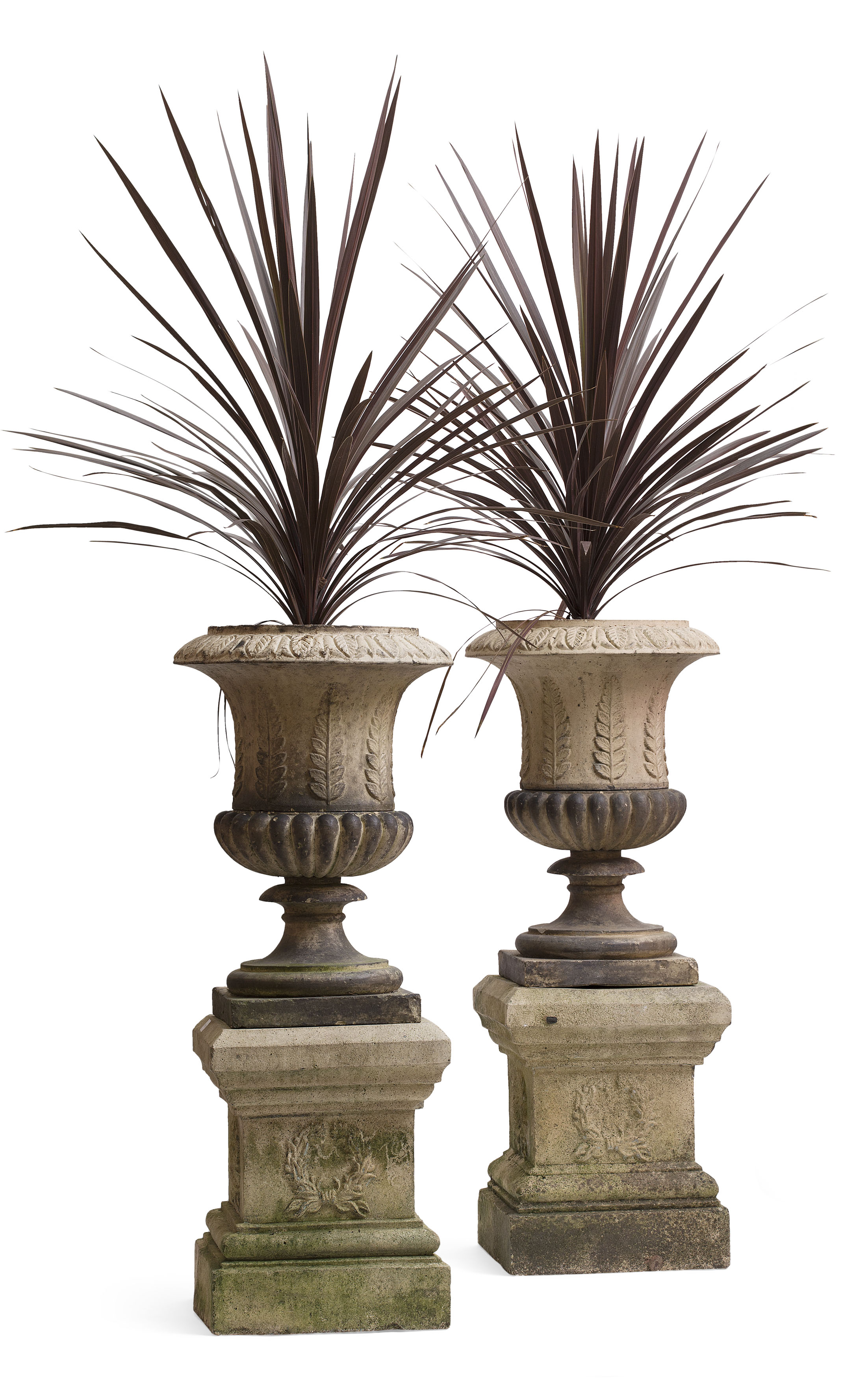 each of campana form with leaf mouldings on a socle with square base, the plinths cast with wreath decoration (2)