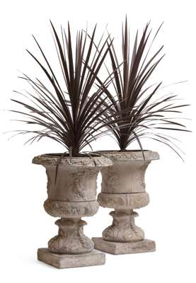 each of campana form with vine mouldings on a leafy socle with square base, impressed maker's mark WM. BROWN/ FIRECLAY WORKS/ DALKEITH (2)