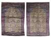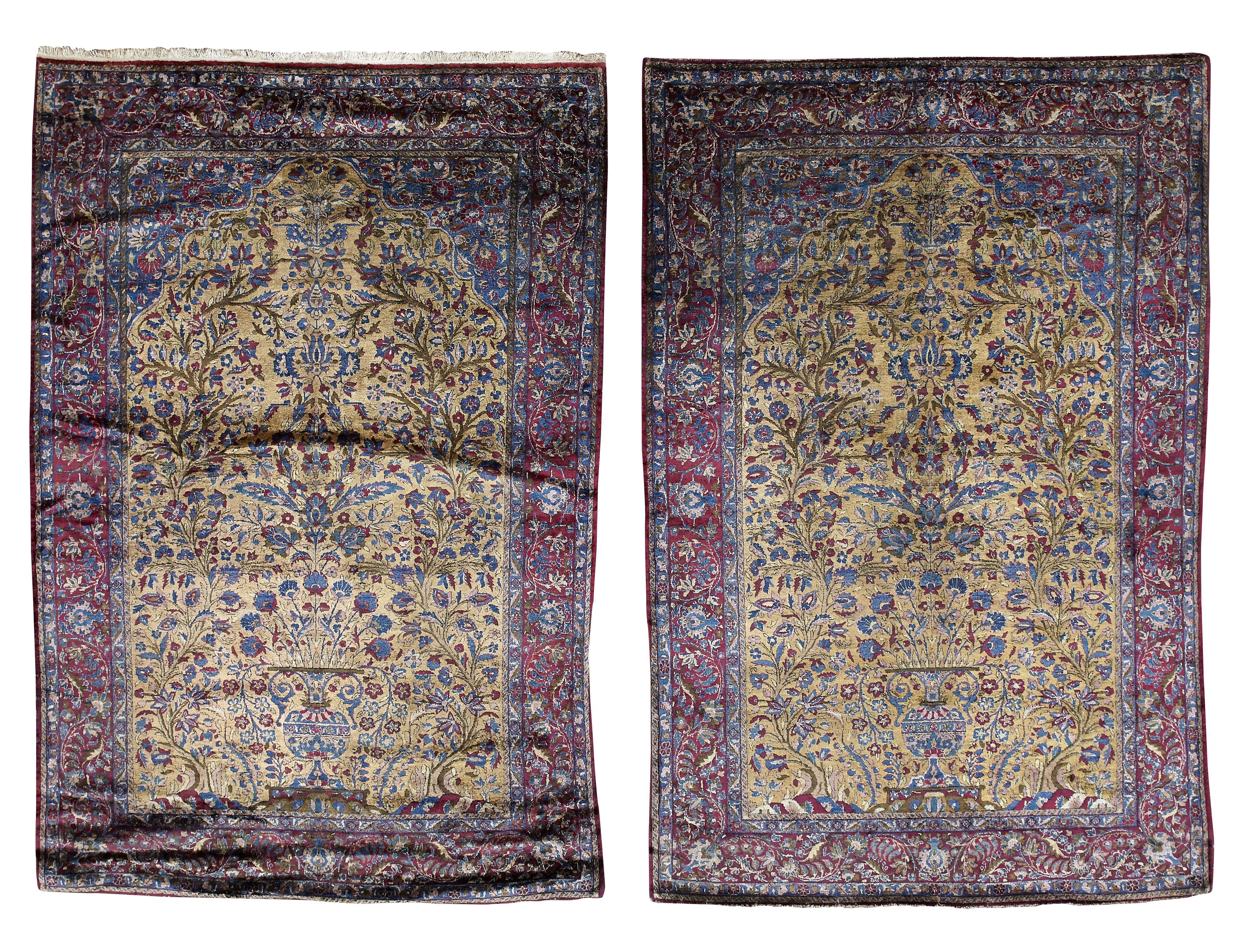 each with light brown field with vase, trees and foliate decoration, indigo spandrels, within burgundy palmette and vine border between indigo bands (2)