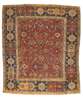 the red field with allover palmette and foliate vine pattern, within indigo cartouche border between cream bands