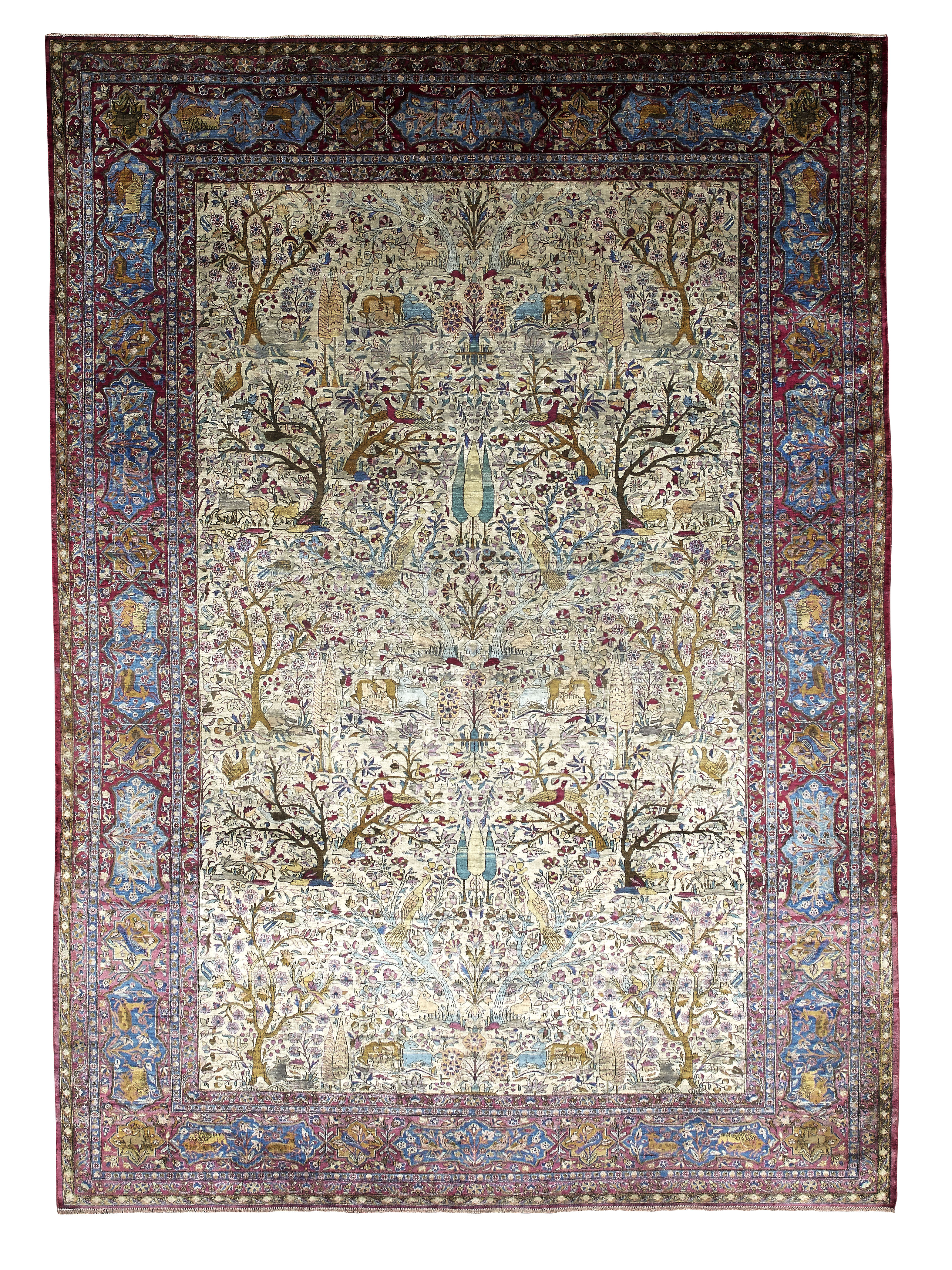 the cream field with allover animals, birds and foliate trees decoration, within burgundy animal, bird and foliate cartouche border between bands