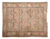 the light pink field with allover floral vase pattern, within light pink rosette and arabesque vine border