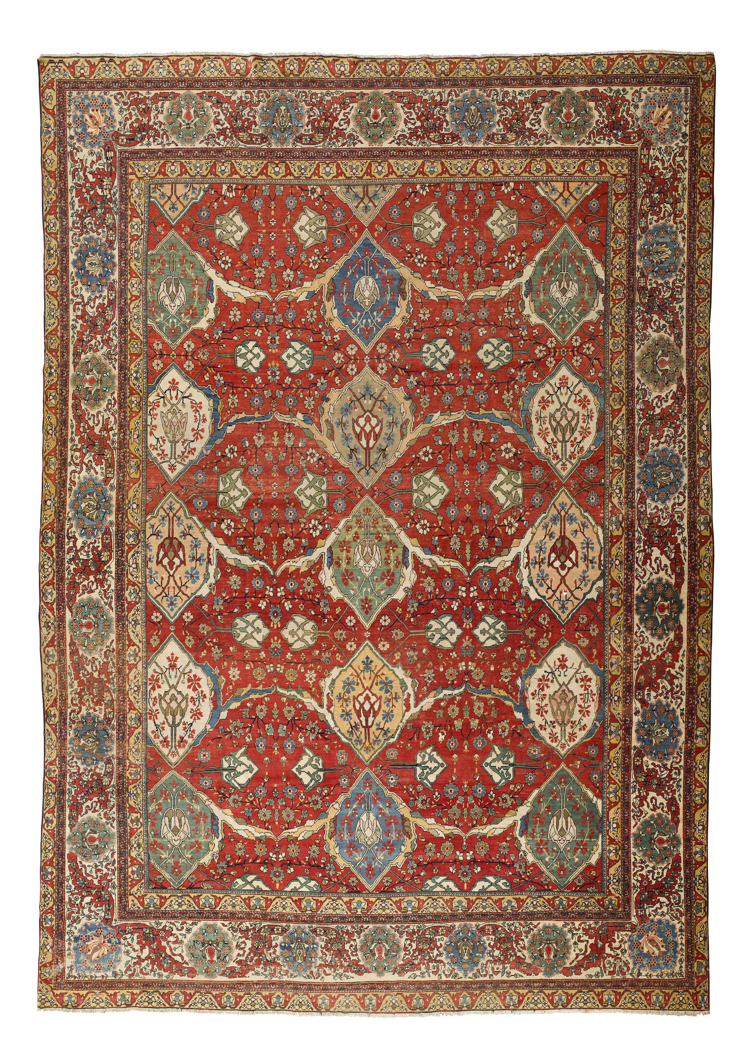 the red field with three columns of five large polychrome turtle palmettes, within cream palmette and vine border between yellow bands