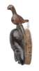 the elongated face with shaped features, below a carved figure of a bird, dark patina, 40cm long; together with an AFRICAN CARVED WOODEN MASK, of tapered squared form, with simple features, paper label to reverse, 22cm long (2)