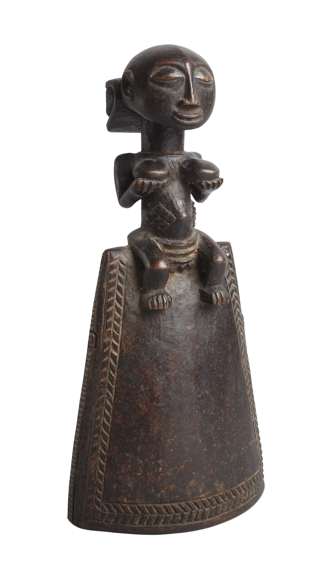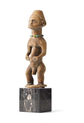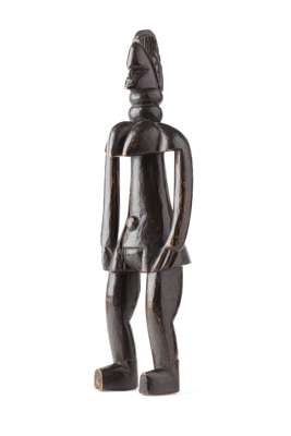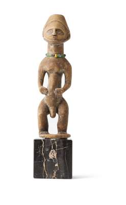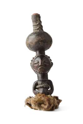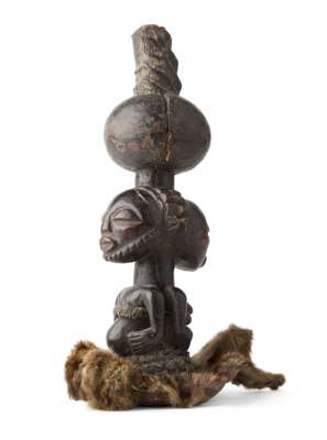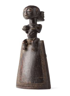 comprising of: a Senufo maternity figure; a small Hemba figure, raised on a marble base; a Songye figure; a Luba bell; and a Luba janus fertility figure (5)