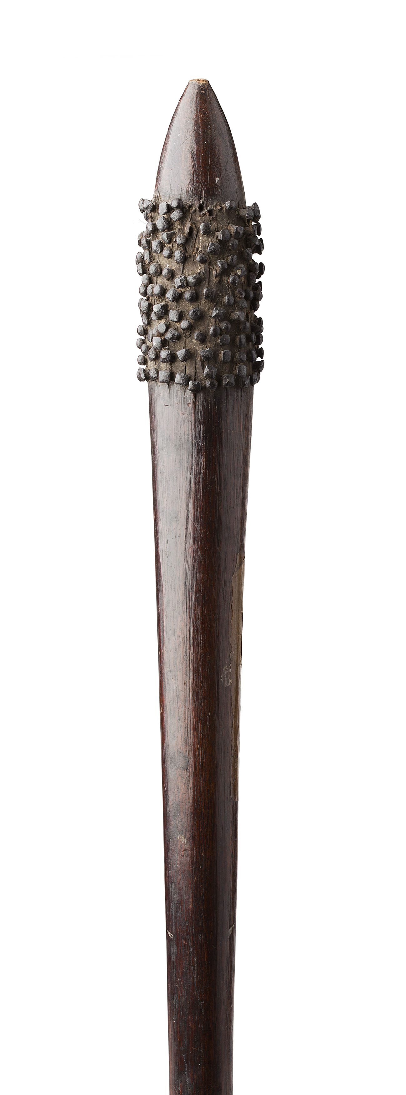 the first, of tapered form, with a leather bound handle above the smooth shaft with incised decoration, 73cm long; the second, of similar form, mounted with old iron nails to the handle, 70cm long (2)