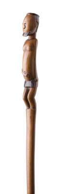 the carved handle in the form of a bearded figure wearing a head-ring and an apron, above the tapered shaft