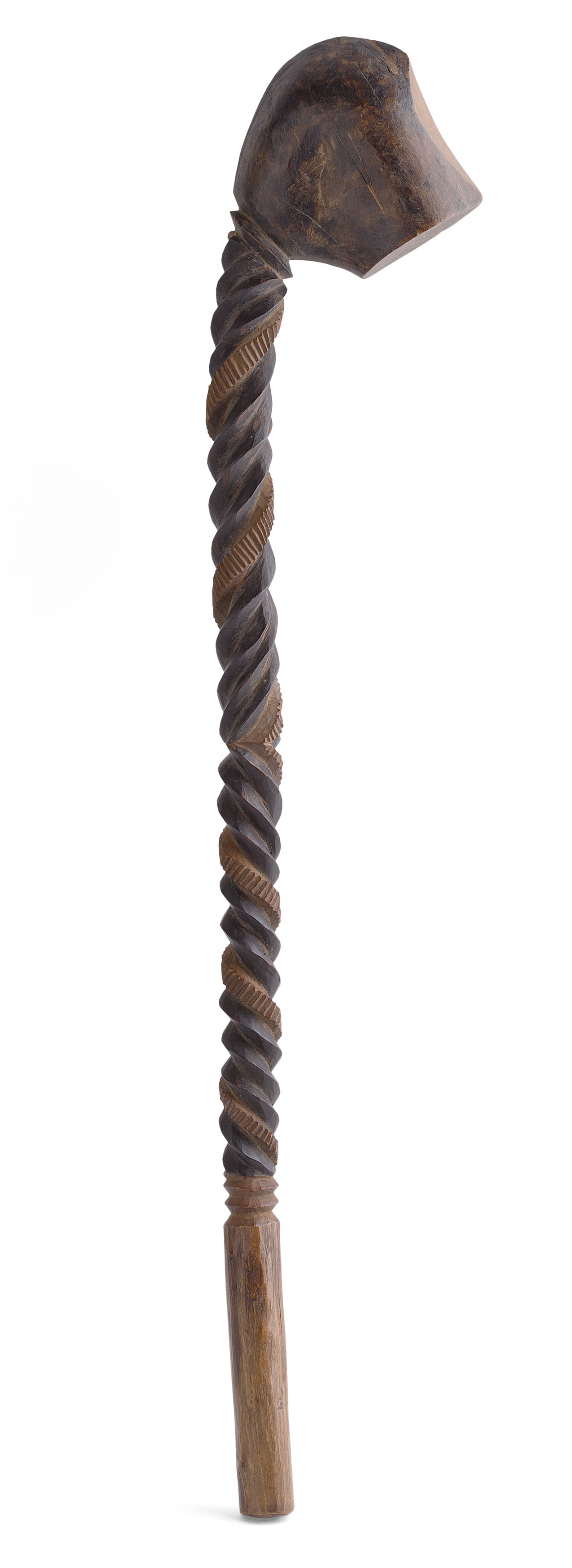 the shaped handle above a carved wrythen shaft with stained and incised decoration