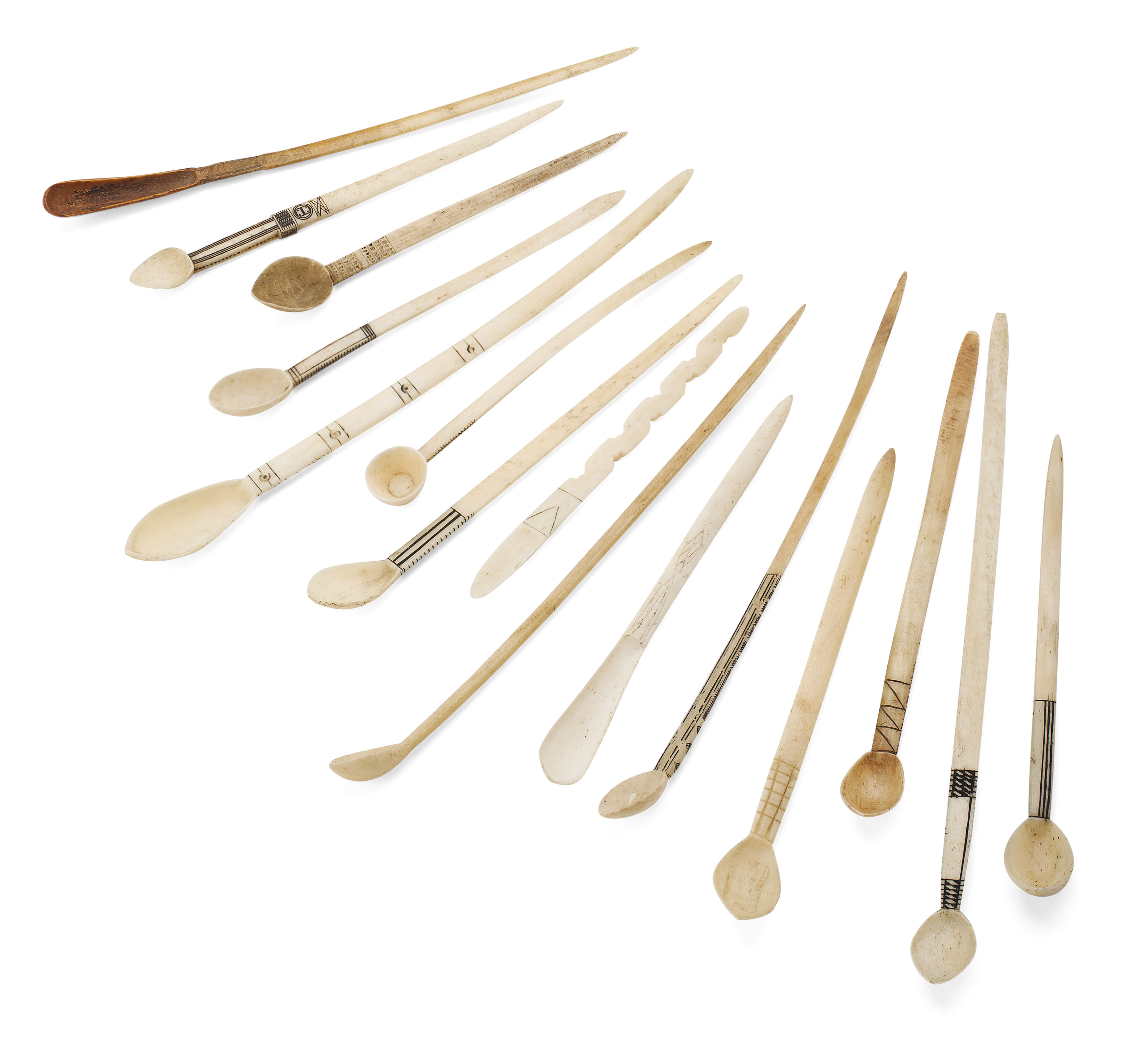 comprising fifteen examples, of various shapes and sizes, including incised and blackened stained spoons depicting geometric bands and motifs (15)