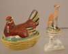 and a yellow basketwork stand, 13.5cm wide; also a small Staffordshire figure of a seated rust painted greyhound, 11cm high; and a miniature Staffordshire figure of a lamb, 6.5cm wide (3)