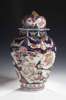 late 17th century, the domed cover decorated with shaped panels of flowers (replaced finial), the vase with segmented stylised flowerhead frieze and swag decorated shoulder, above fan and mon shaped panels of freely painted flowers, all reserved on a blue and gilt ground