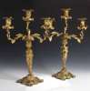 each cast in the mid 18th century taste with three scrolled branches with elaborately cast nozzles and drip trays and applied leaves, the baluster stems raised above spreading bases (2)