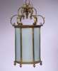 of hexagonal form, with opaque glass panels in mounts suspending finials and supported by double C-scolled arms with ring loops
