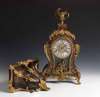 the French twin train movement with circular gilt brass dial and with enamelled Roman chapters, set within a waisted case with glazed door and applied C-scroll and rocaille mounts, 53cm high, also a matching bracket stand, similarly decorated