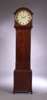 the twin train movement with anchor escapement striking on a bell, the enamelled circular dial with Roman chapters, the arched hood above trunk with shaped door flanked by reeded quarter columns, on panelled base with splayed feet