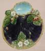 of scalloped form with oval duck-egg blue well, relief moulded with strawberries, leaves and flowers on a blue ground, impressed Minton mark and Victorian registration mark