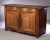 the rectangular planked top with moulded edge, above three drawers and three panelled doors flanked by moulded uprights raised on stile supports with shaped apron below