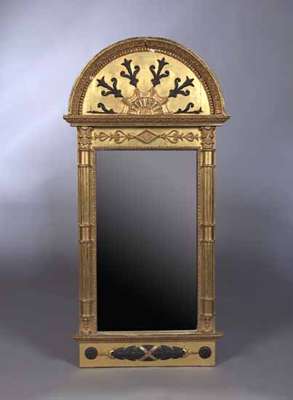 the rectangular bevelled plate flanked by fluted half columns with leaf carved capitals, moulded arched surmount and ebonised laurel pendent