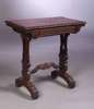 profusely carved, the rectangular top with moulded edge above frieze drawer and pierced trestle supports joined by stretcher, on curved bases
