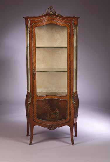 with gilt brass mounts, the concave arched cornice above serpentine glazed door and sides enclosing glass shelves, with Vernis Martin panels below, on sabre legs with sabots