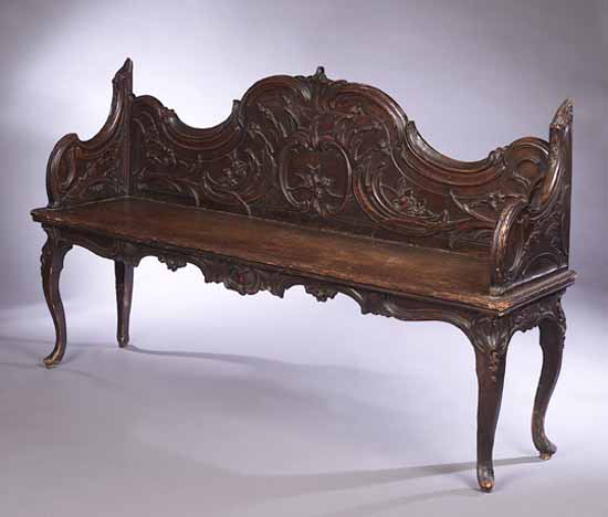 with allover Rococo carved decoration, the arched back profusely carved with C-scrolls, frieze and flowers, flanked by shaped arms on a solid seat raised above a carved frieze on cabriole legs