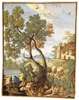 with rustic building and figures with sheep to right hand side, tree in central foreground with two figures on a track, tower in the middle ground