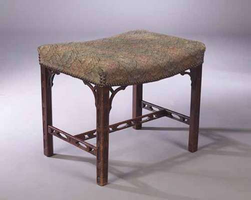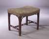 the hollow rectangular top with stuffover flamework upholstery, blind fret square section chamfered legs with pierced brackets and H-stretcher