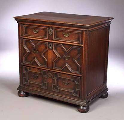 the moulded rectangular top above three long graduated panelled drawers, on plinth and later bun feet