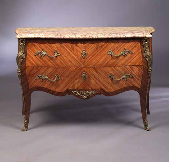with gilt brass mounts, the shaped rouge marble top with lobed angles above two long registering drawers incorporating shaped apron, raised on splayed legs with sabots