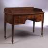 with satinwood crossbanding and boxwood stringing, a shaped top with three quarter gallery above two frieze drawers flanking the kneehole, on square section tapering legs with spade feet and castors