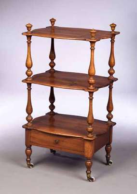 each tier of shaped rectagular form divided by baluster turned upright surmounted by finials above a lower drawer on turned legs terminating in pot castors
