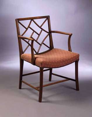 of George III style, each with lattice-filled back and scrolled arms, the upholstered seat on moulded legs joined by stretchers