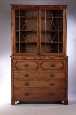 the moulded and projecting cornice above twin astragal glassed doors enclosing adjustable shelves, the lower section with panelled secretaire drawer enclosing an interior fitted with drawers and pigeonhole over the long graduated drawers on bracket feet
