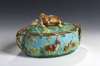 the cover modelled with a quail with one chick under wing and five chicks surrounding, on fern decorated ground, the rustic handles with vine decoration, the body with hare and leverets on a turquoise ground with acorn and fern decoration, printed mark and Victorian registration mark, impressed letter 'T'