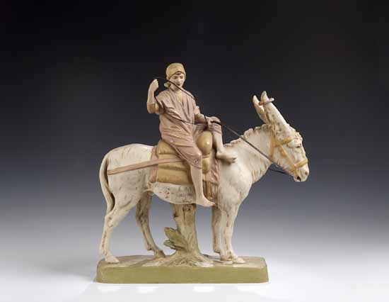 depicting a figure wearing a turban and a flowered salmon pink gown, sitting side saddle on a donkey on naturalistic rectangular plinth, with pink triangular mark and impressed number marks