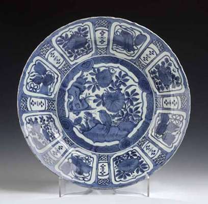 Wanli, the central painted panel depicting two birds amidst blossom, with wide basket weave and geometric motif panels, the flared border with fan shaped panels of flowers alternating with stylised fish scale panels, the underside sparsely decorated