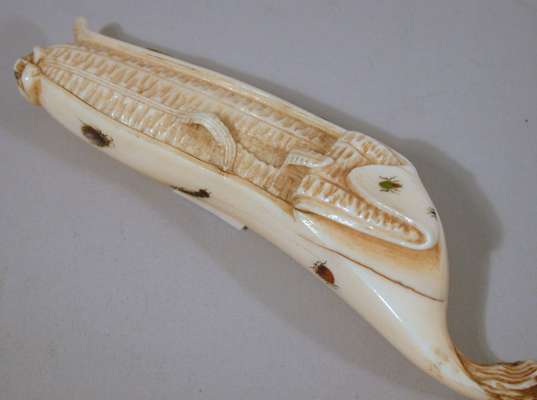 with the upper skin almost fully peeled back, decorated with eight various insects