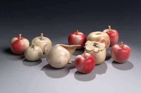 A collection of five Japanese carved ivory life-size red stained crab apples