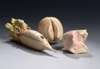 with slight pink staining to top of vegetable and elaborate green stained leaves, large grasshopper and small ladybird, with carved protrusions and crack to flesh