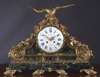 the twin train movement with anchor escapement striking on a bell, the circular domed enamelled dial within drum surmounted by eagle and serpent flanked by console supports with marble inserts, on breakfront marble plinth with supporting cast feet